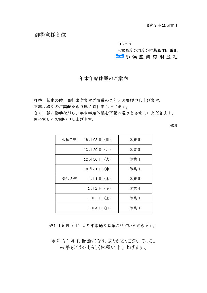 皆様こんにちは。小俣産業ウェブサイトをご覧いただきありがとうございます。